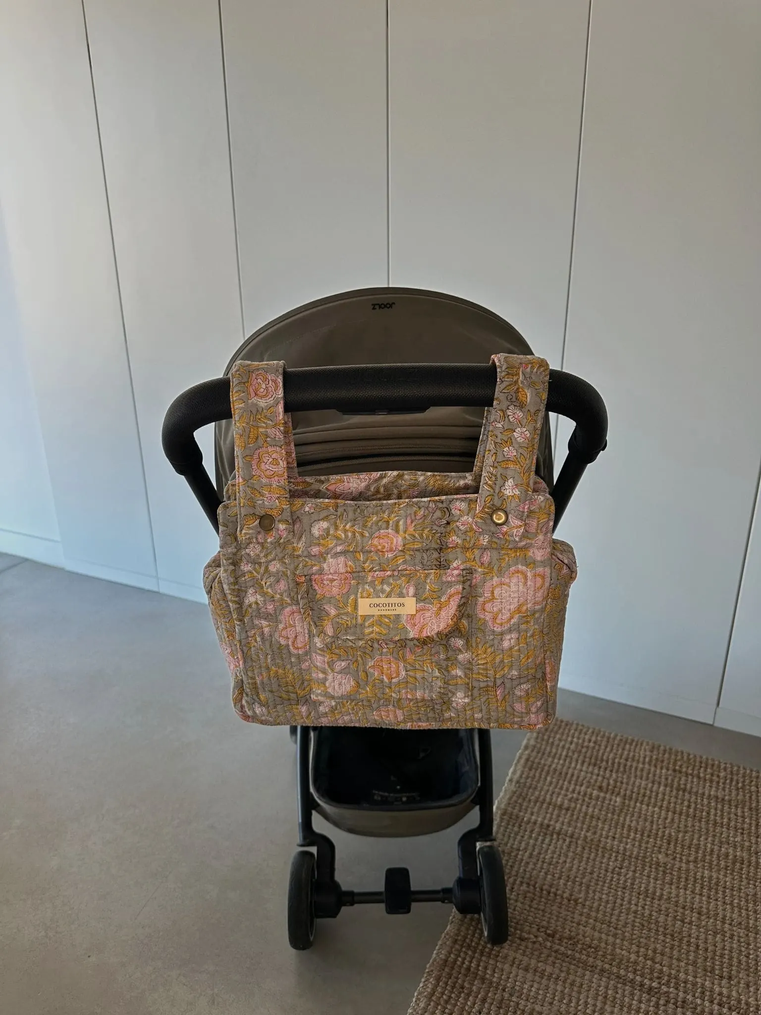 Práctico y compacto, este bolso de paseo incluye cambiador. Cuenta con dos asas pequeñas para colgar del carro mediante botones de clic y un asa regulable para llevarlo al hombro o en bandolera.